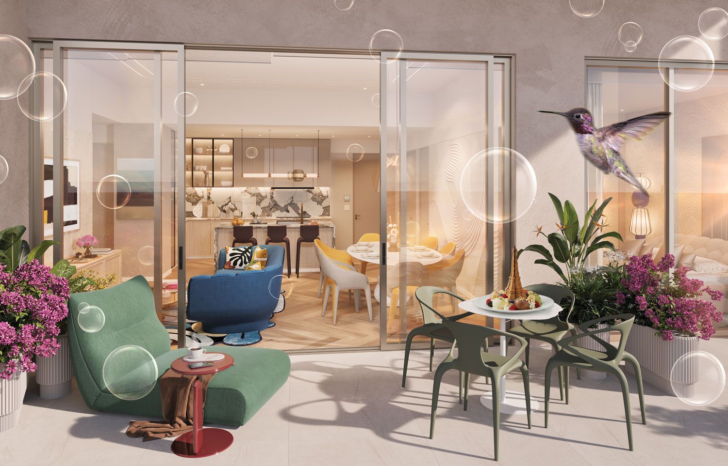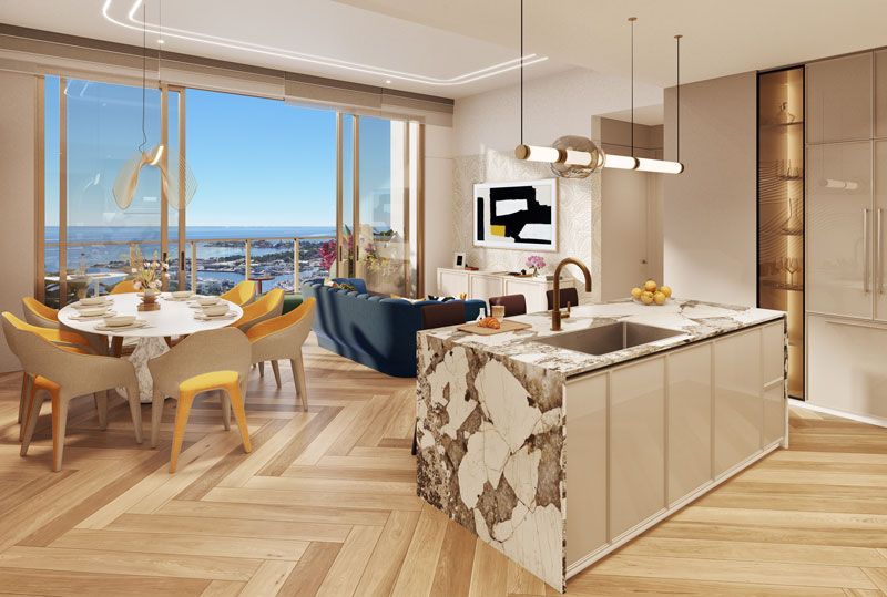 Thoughtfully designed layouts𑁋from intimate studios to palatial penthouses𑁋feature premium cabinetry, bespoke millwork, designer kitchens with luxury appliances, premium flooring, and custom-crafted vanities. Curated Roche Bobois furniture packages and smart-home upgrade options allow every residence to become a personal canvas, shaped by comfort, artistry, and contemporary sophistication.